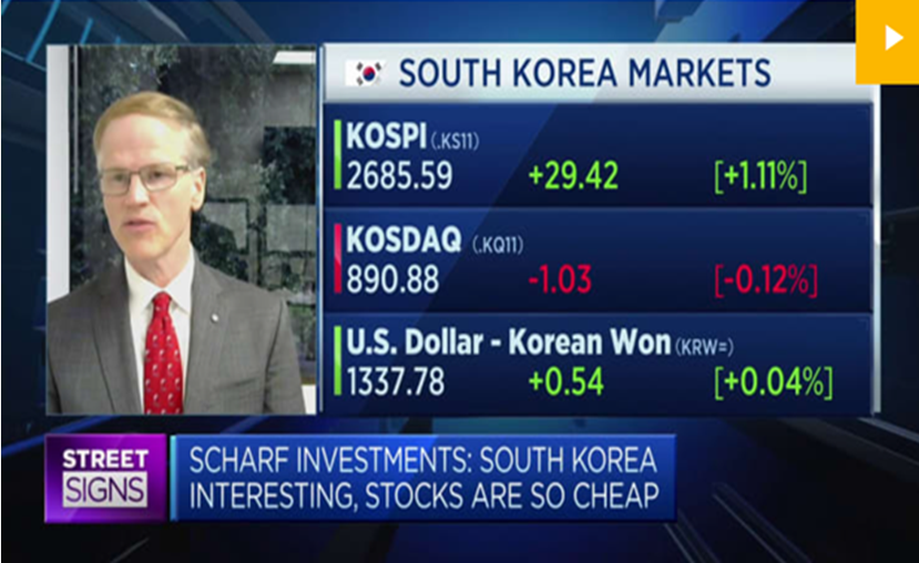 Brian Krawez, president and lead portfolio manager of Scharf Investments, says that while he believes Korean stocks are “very, very cheap,” the ‘Korea discount’ could start to close with ongoing government reforms. Brian recently shared his thoughts on the opportunities we see in both Korea and Japan with Tanvir Gil on CNBC Asia’s “Street Signs.” While we see similarities in both markets in terms of growth—look at Toyota vs. Hyundai, for example—the valuations among Korean companies are very compelling at this time.